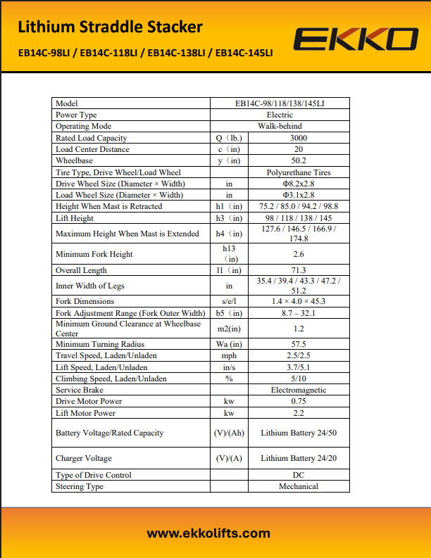 Optimize your warehousing and material-handling operations with the EKKO EB14C, a full-powered straddle stacker engineered to deliver high performance in tight aisles, loading docks, and busy manufacturing floors. This electric walk-behind stacker bridges the gap between forklifts and pallet jacks, giving you the versatility to handle heavier loads with ease and precision.